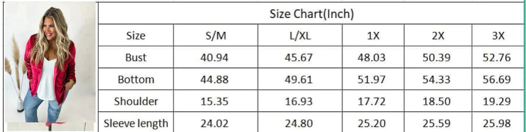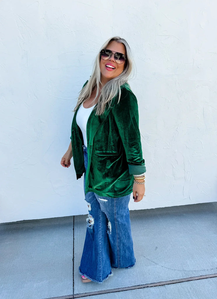 This velvet blazer is a soft and comfortable statement piece that you cant go wrong with! An easy way to dress up any outfit. Features functional buttons, side pockets and lined with a stretchy soft fabric. The jacket itself also has stretch!